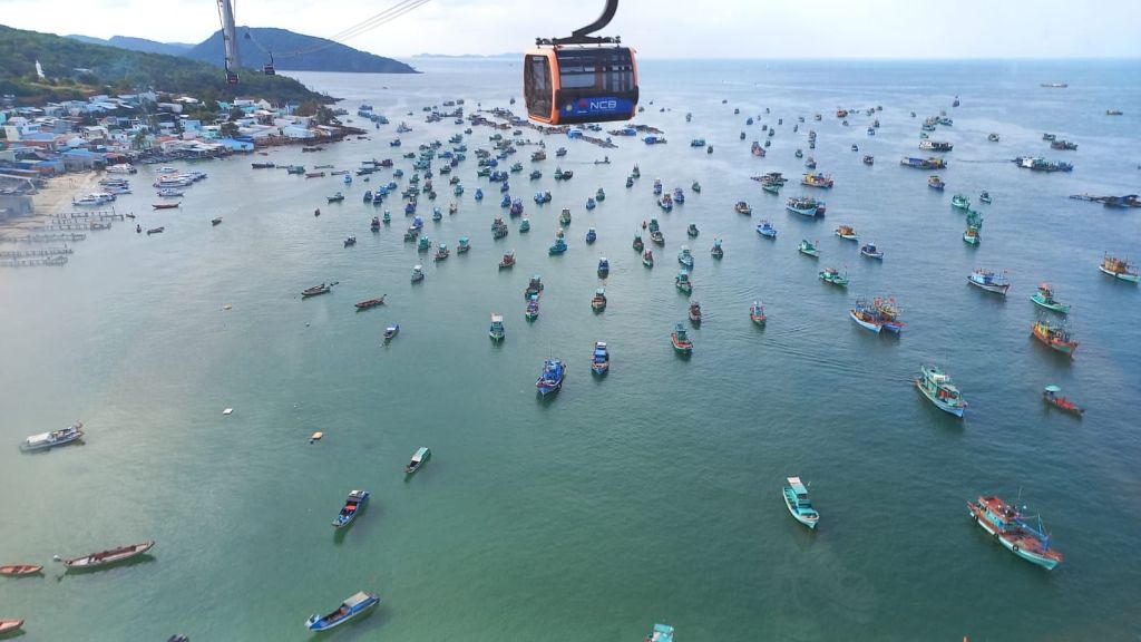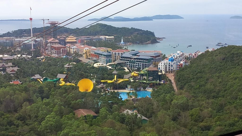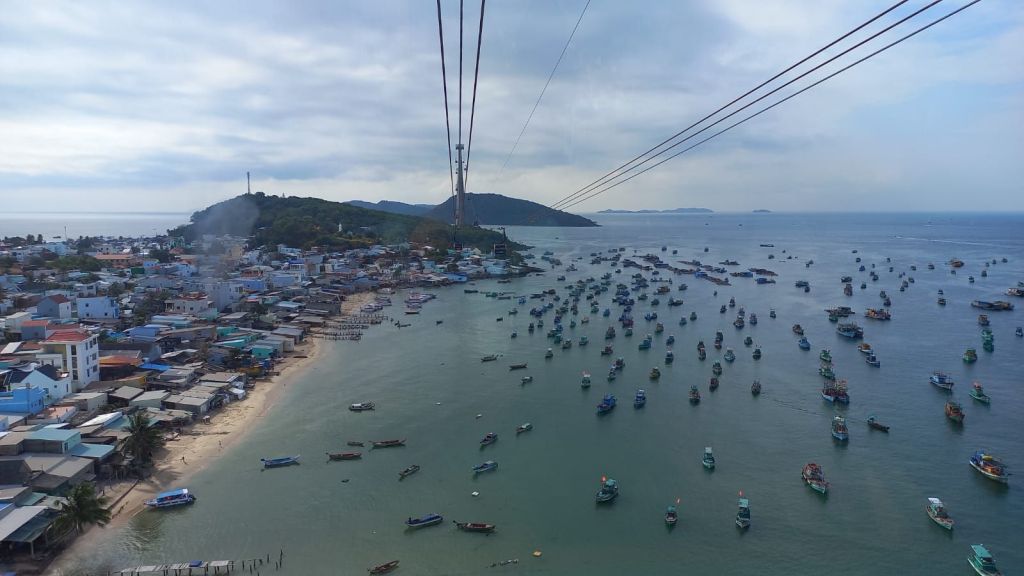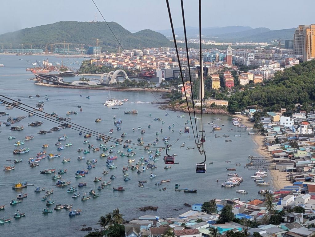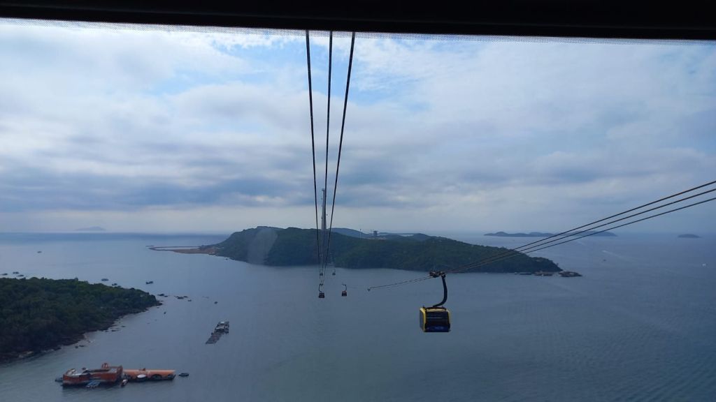 Wir sind mit die ersten heute, die die längste Seilbahn der Welt besteigen und wir schweben die 8 km über mehrere Inseln.