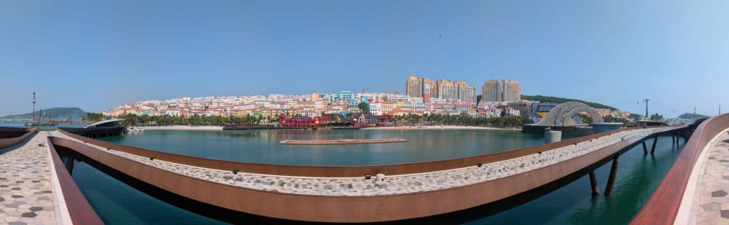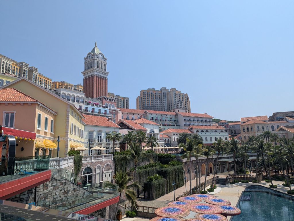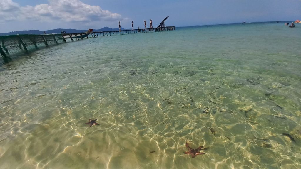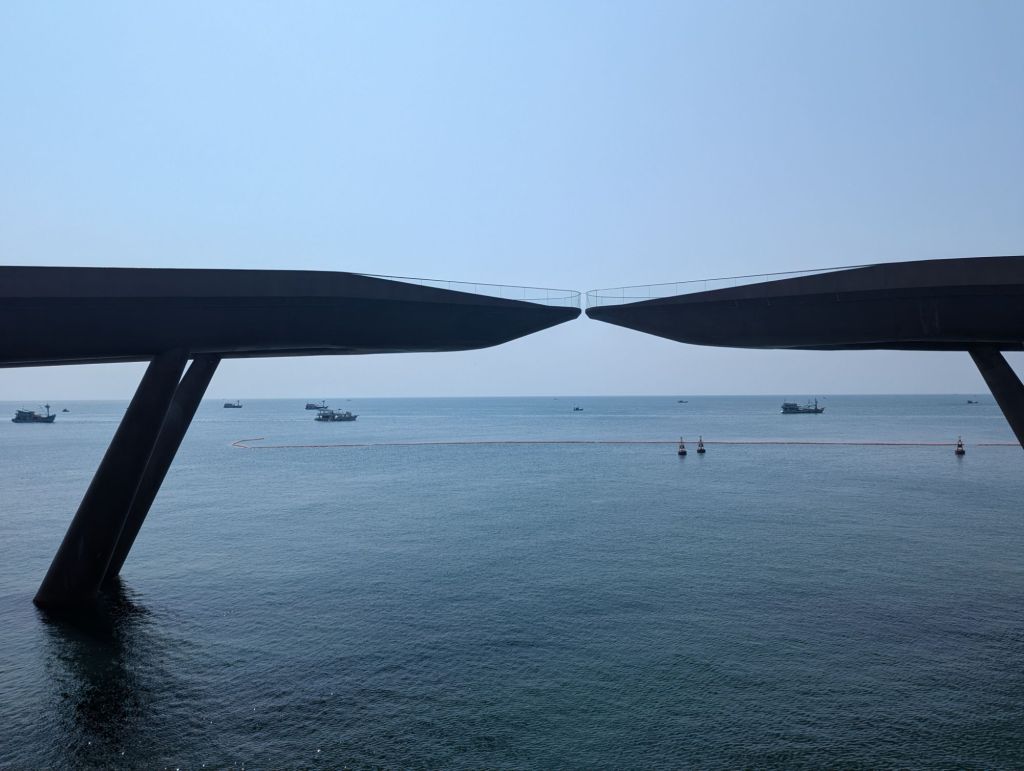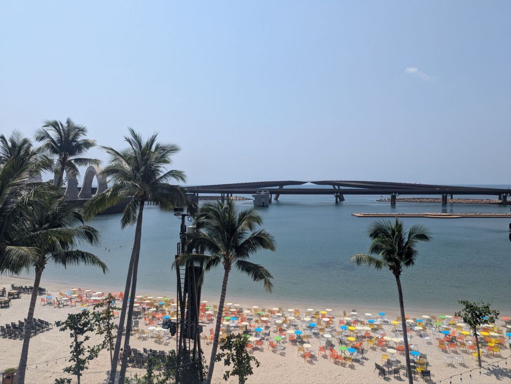 Wir sind mit die ersten heute, die die längste Seilbahn der Welt besteigen und wir schweben die 8 km über mehrere Inseln.