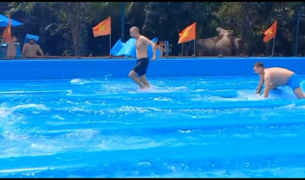 Wir machen Rutschenwettrennen gegeneinander, auf einer Art Yogamatte bäuchlings liegend. Ein kleiner Junge traut sich den Sprung in die Röhre oben nicht mehr zu und bekommt einen Heulkrampf und verweigert den Start. Marcus gewinnt das Rennen noch, aber nur weil er mit der Matte durchs Ziel rennt.