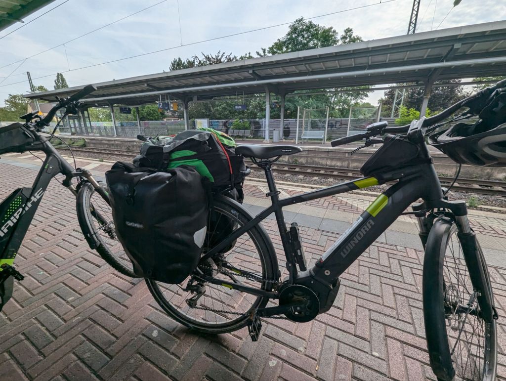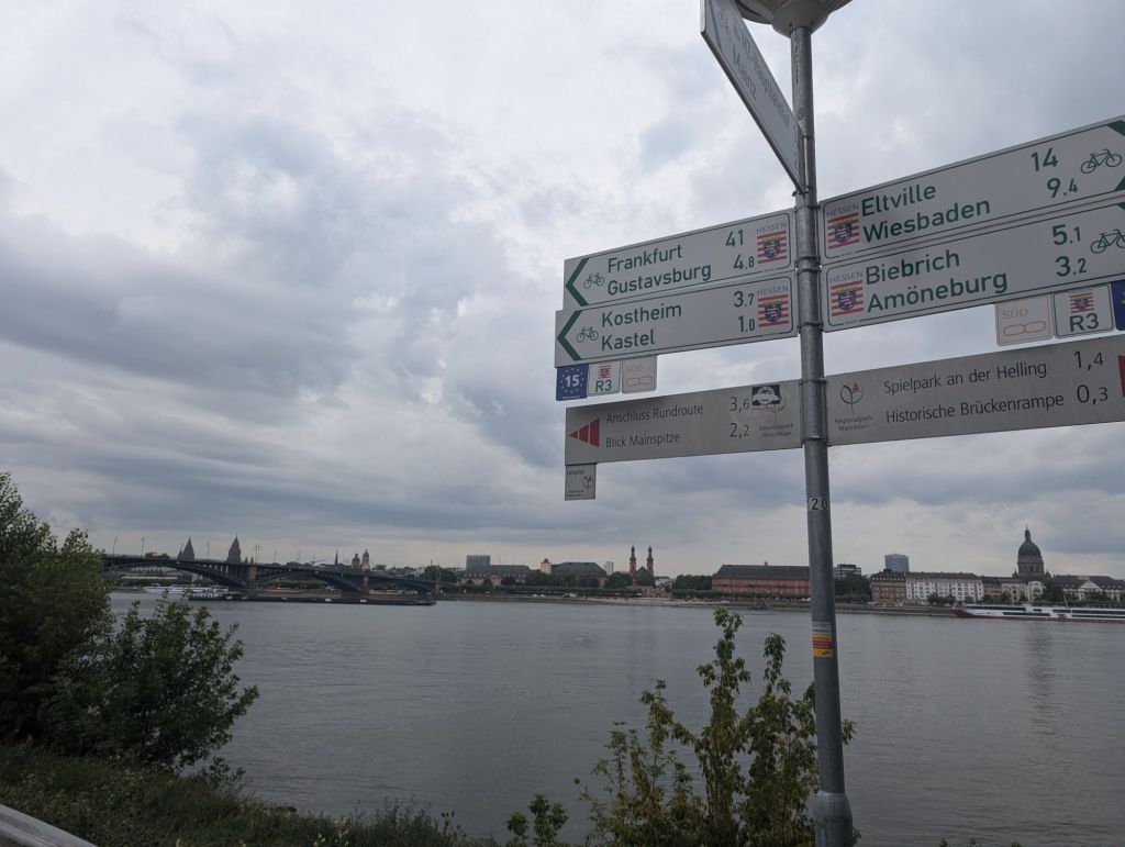 Von Brühl bis Koblenz geht es mit der Bahn richtig schnell. Ab Koblenz Hbf herrscht allerdings Chaos, Gleiswechsel des Zuges nach Frankfurt und wir mit unseren Fahrrädern mittendrin im Menschenstrom. Anstehen am Aufzug haben wir aufgrund der langen Schlange direkt verworfen, also Rolltreppe mit den schweren Rädern runter und am anderen Gleis wieder hoch. Der Zug fährt ein und hört gar nicht auf Menschen auszuspucken, allerdings drängen die Massen jetzt im Gegenstrom in den Zug hinein. Wir schaffen es so gerade mit den Rädern hinein und stehen dicht an dicht mit den Mitreisenden. Dann erschallt die Durchsage nur für uns “ Die Reisenden mit Fahrrädern verlassen jetzt den Zug!“ Der krasseste Rauswurf, den ich je erlebt habe. Also doch die Bimmelbahn bis Mainz.