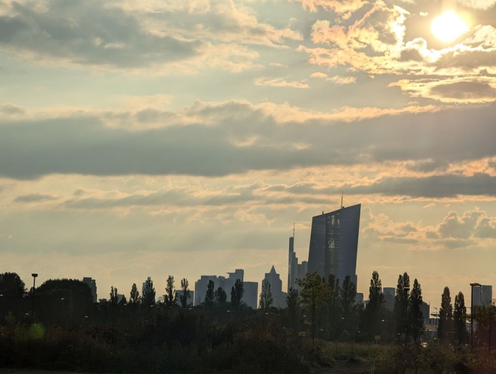 Frankfurt zeigt sich mit seiner Skyline im schönen Sonnenschein nach einem ordentlichen Regenschauer, dem wir an einer Tankstelle unter Sonnenschirmen entgangen sind.