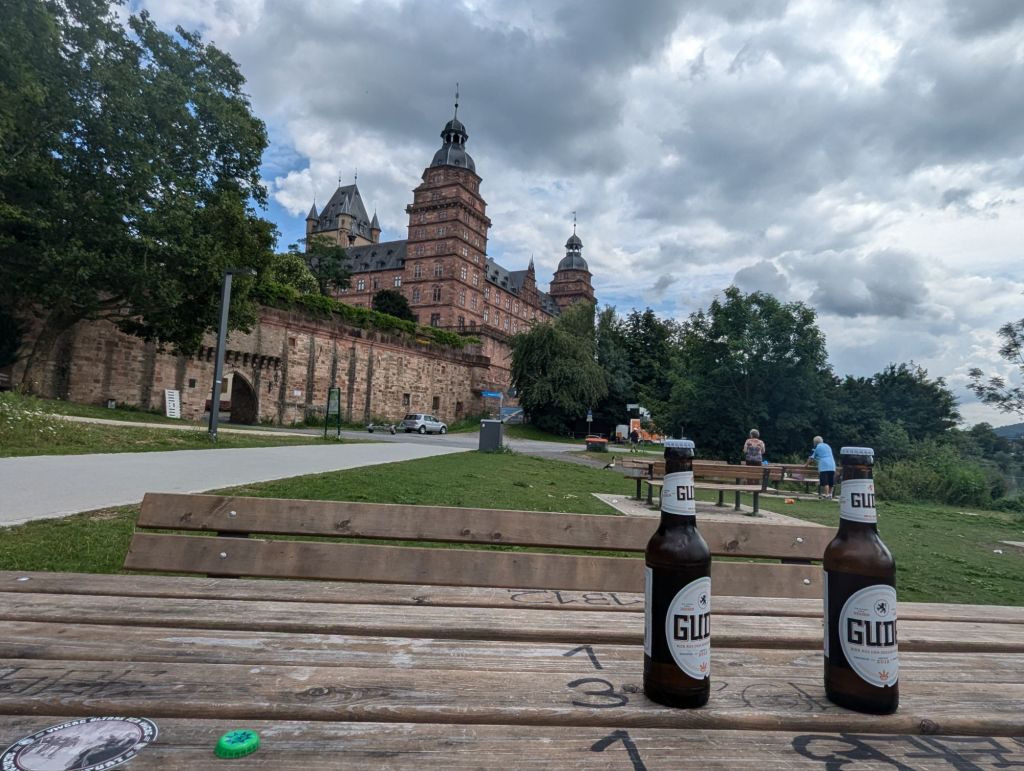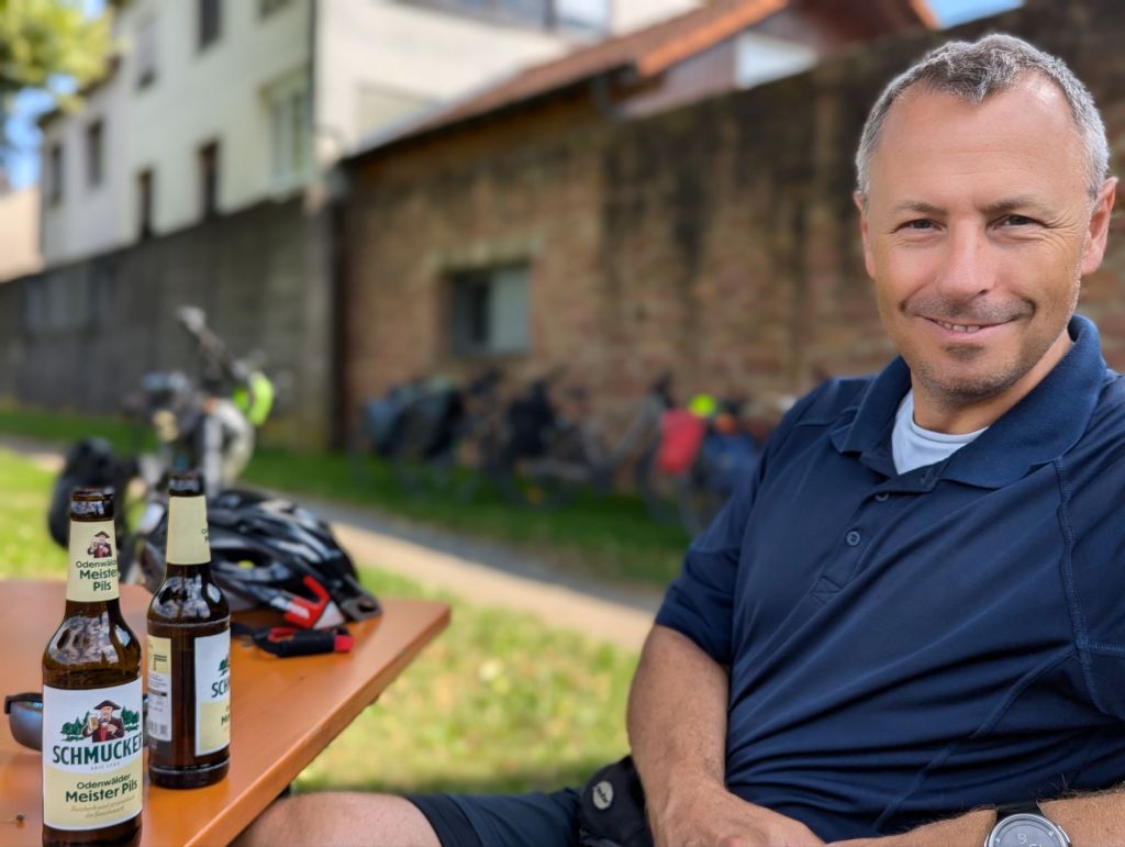 Vor lauter Bierdurst stranden wir 6 km vor unserem Ziel an einem Supermarkt und kaufen uns das typische Helle. Der geschlossene Biergarten lässt uns unter einen Baumdach die eigenen Korken knallen. Nebenbei verdienen wir uns noch Weintrauben, ein Paket Nüsse und eine Flasche Apfelsaft, nur weil wir auf Fahrrad und Tasche des westafrikanischen Gabelstaplerfahrers kurz aufpassen, während er sich das gleiche Bier im Supermarkt kauft. ( Wir hätten es auch umsonst getan), aber er bestand darauf.