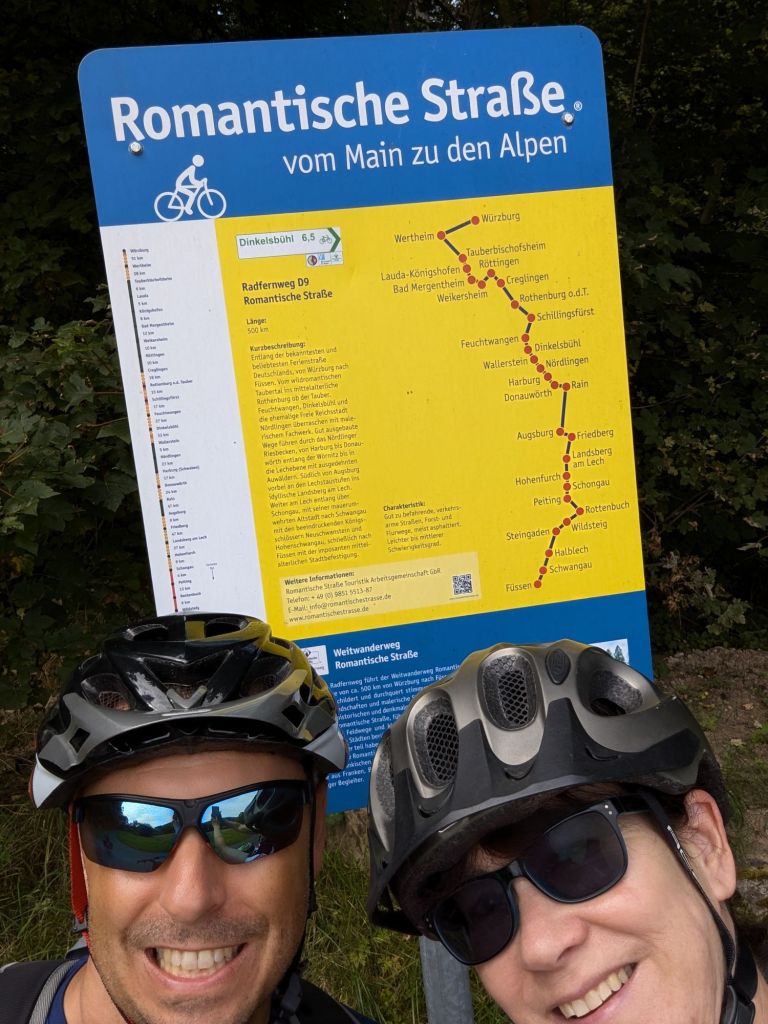 Durch Wälder, entlang von den Flüssen Rhein, Main, Tauber, Wörnitz, Donau, Lech, Amper und Würm und durch so viele Städte mit Postkartenmotiven.Von Mittwoch bis Mittwoch jeden Tag auf dem Sattel bei herrlichstem Wetter.