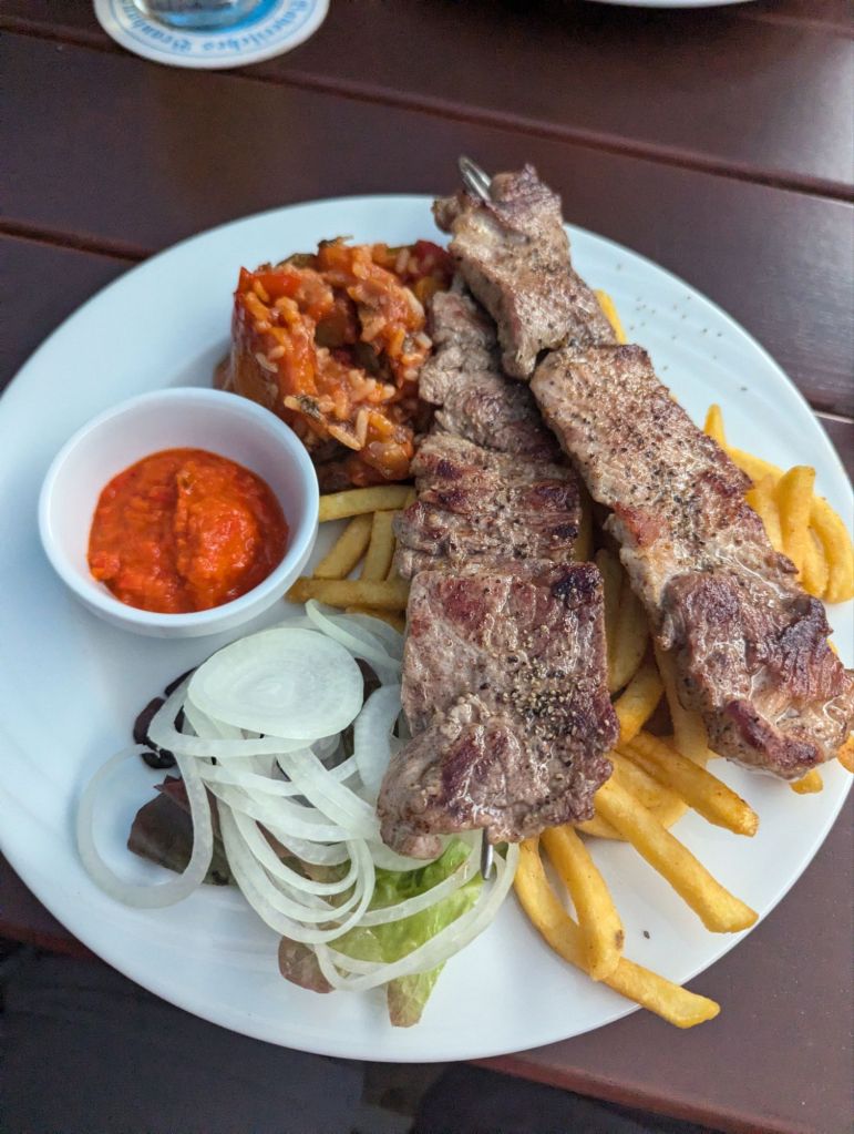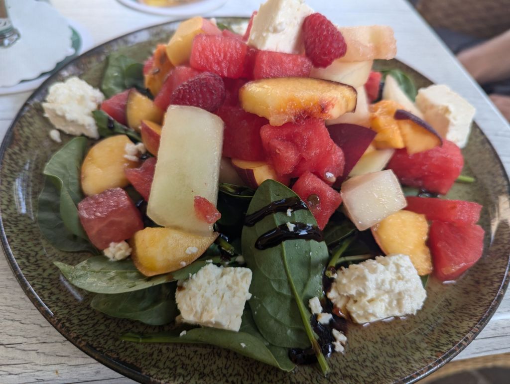 Da wir das günstigste Hotel am Platz genommen haben, genießen wir noch so verrücktes Essen wie Melonensalat mit Schafskäse und planen mit dem Bier in der Hand die Route für morgen.