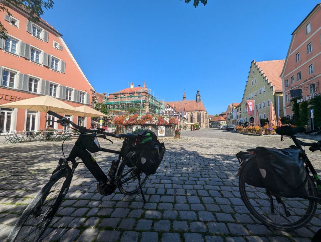 Morgens gibt Marcus das Ziel vor, 95 km bis Donauwörth. Der Mann hat nen Knall bei über 30 Grad und so geht’s im Schneckentempo erstmal bis Feuchtwangen.