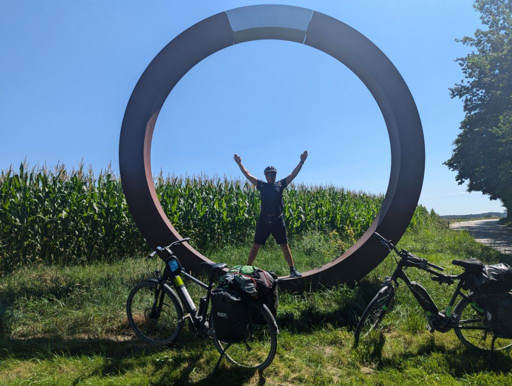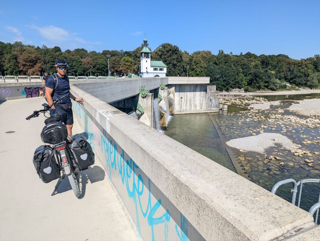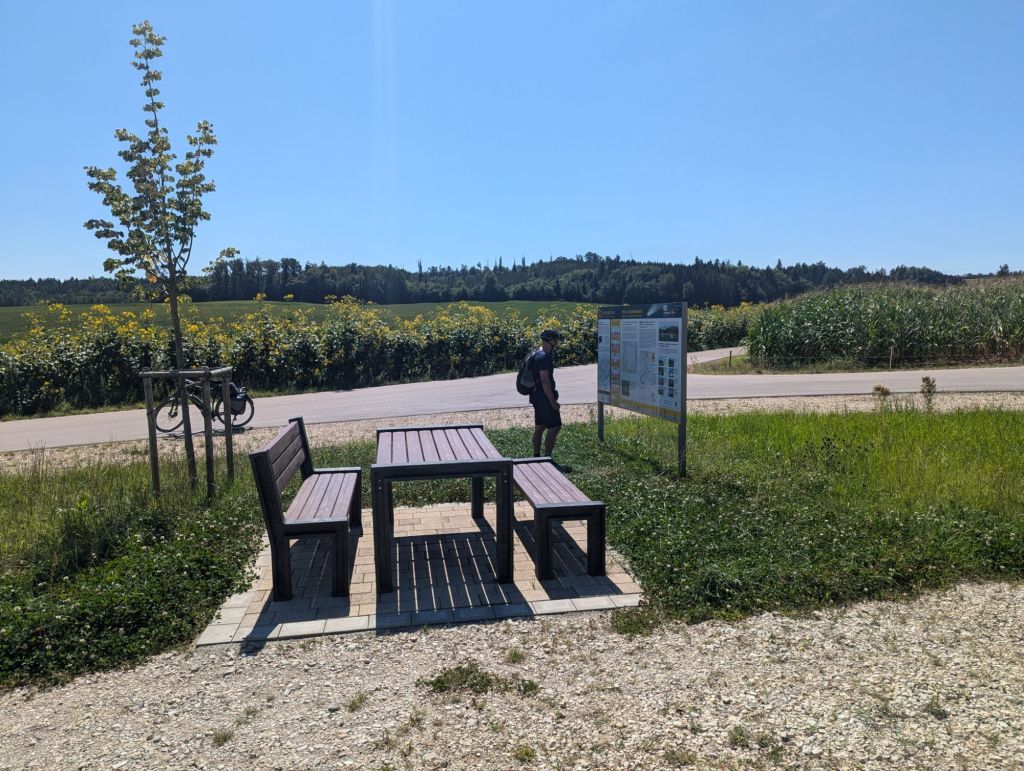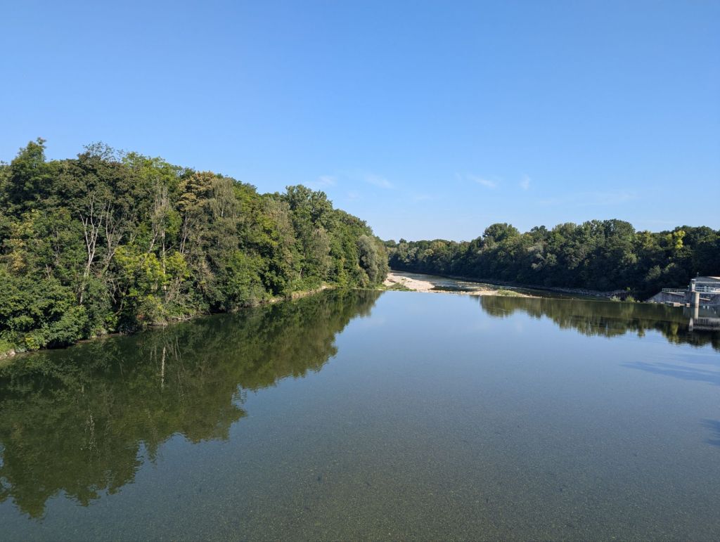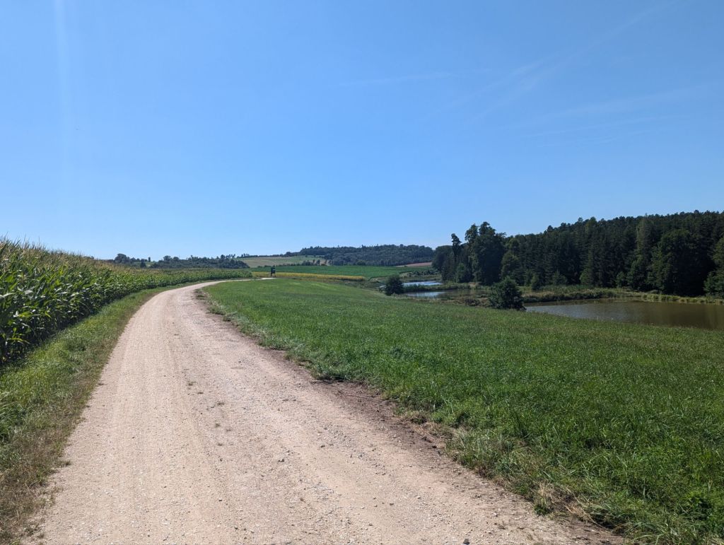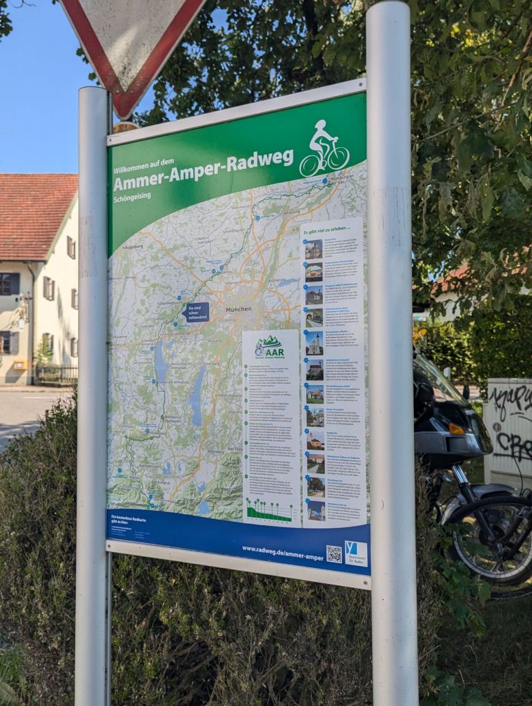Bis dahin also Maisfelder, Auenland und Felder mit Zwiebelkirchen. Als ich kurz vor einem Fahrsteik bin, treffen wir auf den Fluss Amper mit schöner Badestelle.