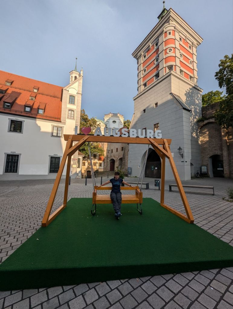 Um 18 Uhr checken wir im Hotel ein und um 19 Uhr sitzen wir in der Straßenbahn durch Augsburg.