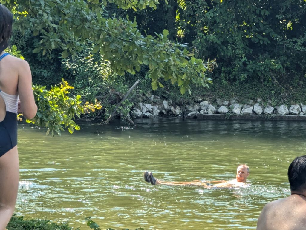 Marcus springt hinein und treibt davon…wie hier üblich 😂. Nach ein paar Metern gibt es einen Ausstieg und man läuft über eine Wiese und das halbe Dorf zurück.
