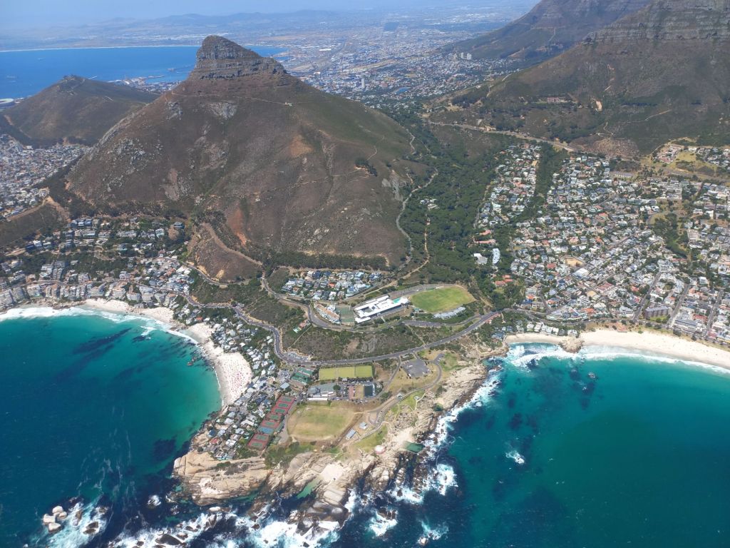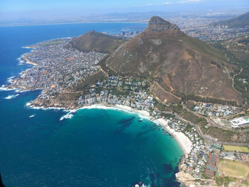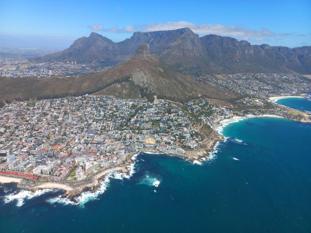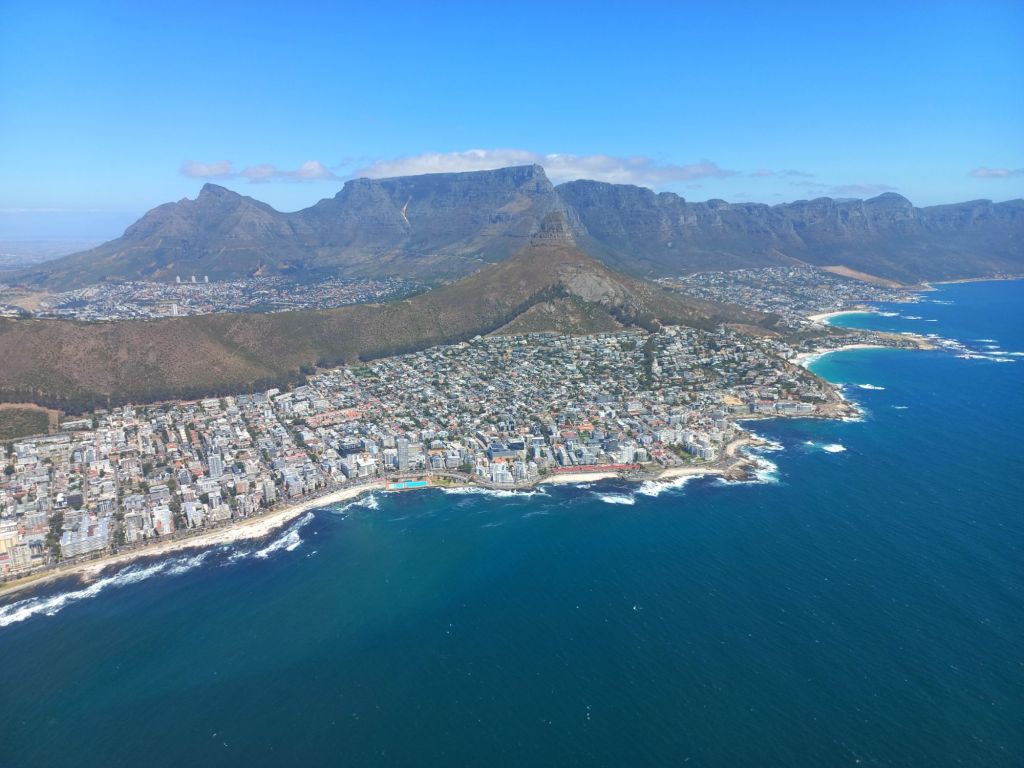 Wir fliegen mit dem Hubschrauber über Kapstadt,