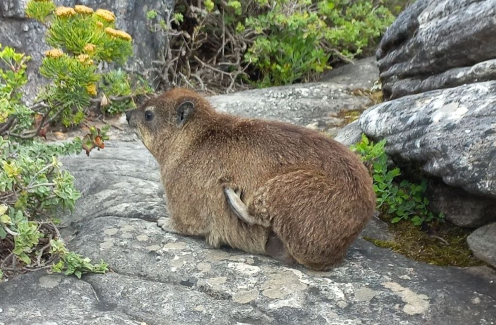 Das sich mit der Hinterpfote kratzende Tierchen ist ein Klippschliefer, so eine Art hässlicher, deformierter Quoka. Ich sollte auch lieber das Panorama fotografieren so wie Marcus.