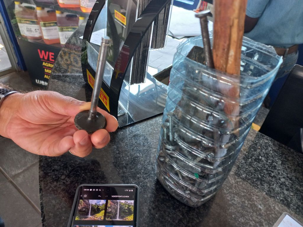 Wir checken nochmal unseren Reifen, ob der auch wirklich dicht ist. Nachdem der Reifenmechaniker an der Kaugummidichtung rumpult ( so sieht das ganze zumindest aus) ist der Reifen nicht mehr dicht und blubbert im Wasserbad. Also nochmal 10 Euro investiert und den Reifen vulkanisieren lassen. In der Wartezeit dürfen wir uns das Ausstellungsglas mit den ehemaligen Reifenbewohnern ansehen, die aber alle Hausverbot bekamen.
