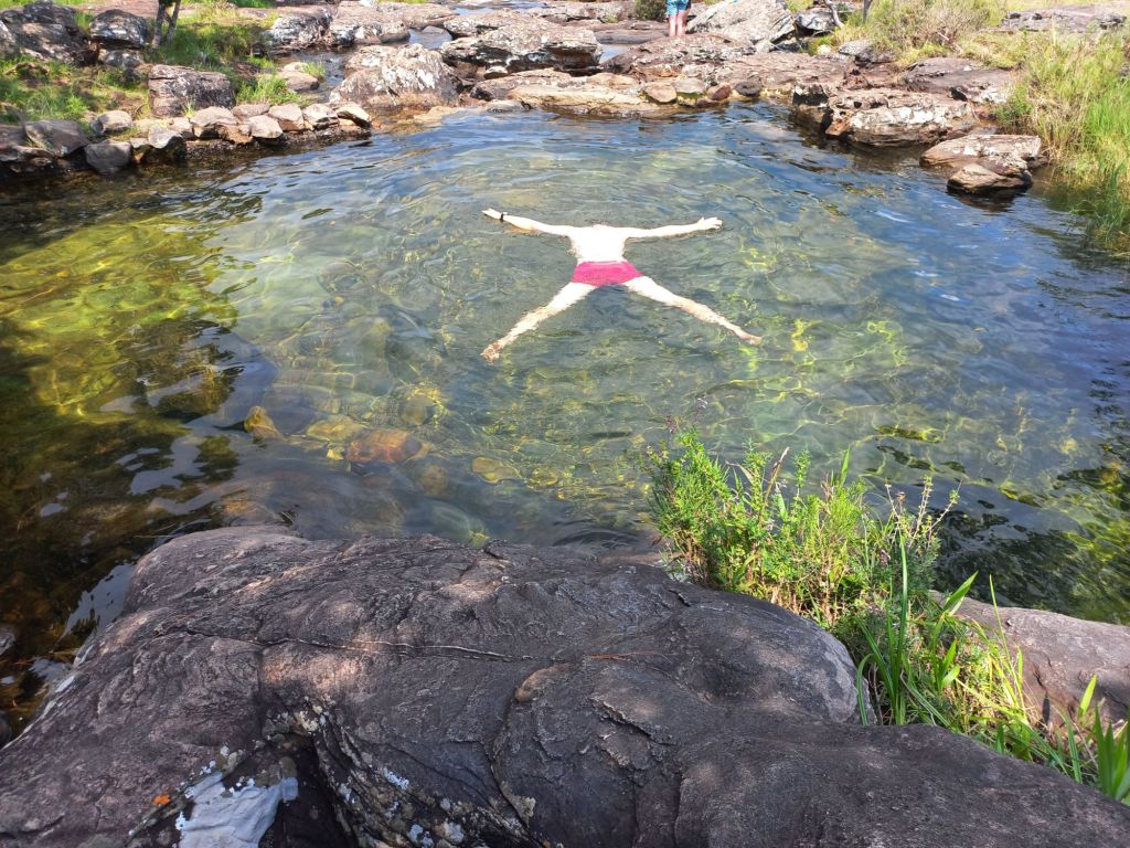 Als ich dann mein Bad nehme, ruft mir Marcus dauernd etwas von einem Wesen im Wasser zu. Er meint er hätte Mini Nessi gesehen, wegen der Mac Mac Pools, die haben doch bestimmt was mit Schottland zu tun. Ich glaube ihm kein Wort und schwimme dann doch tatsächlich mit einem schwarzen Riesensalamander. Mein Schrei hat den armen Kerl dann so sehr erschreckt, dass er sich zwischen den Felsen versteckt hat .