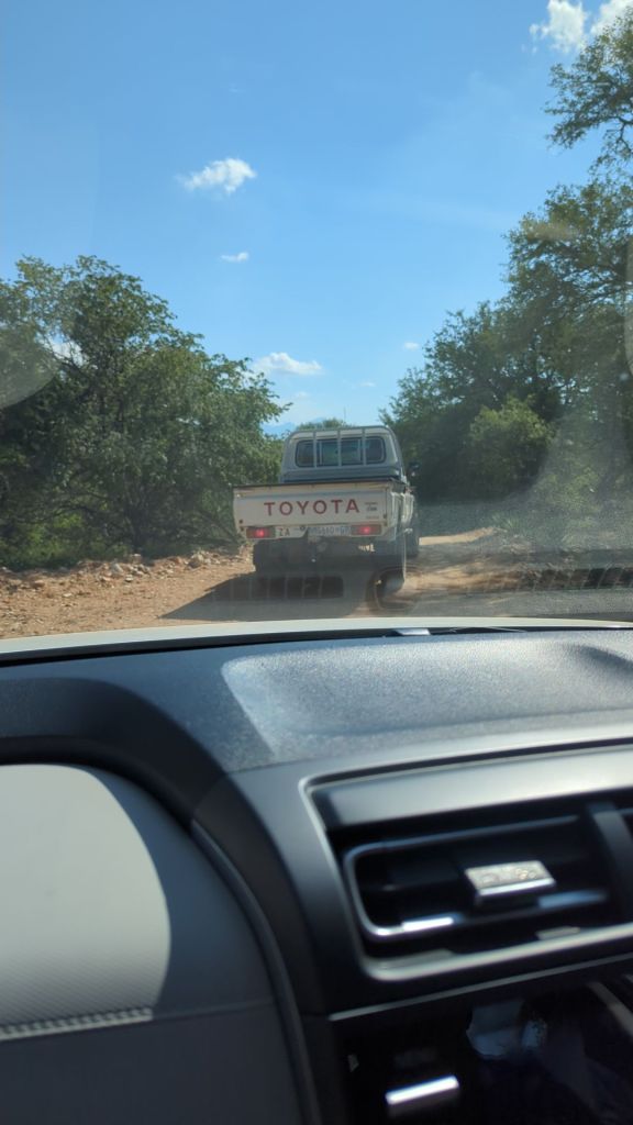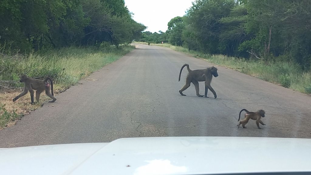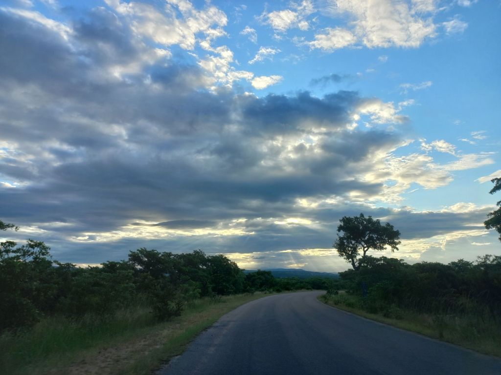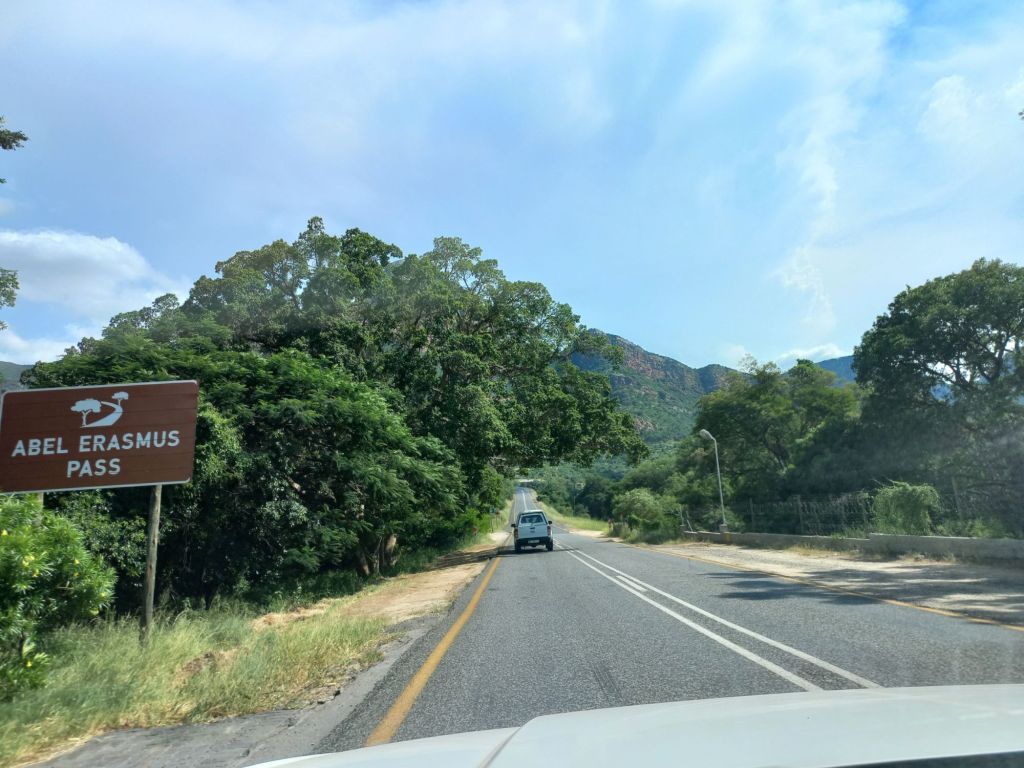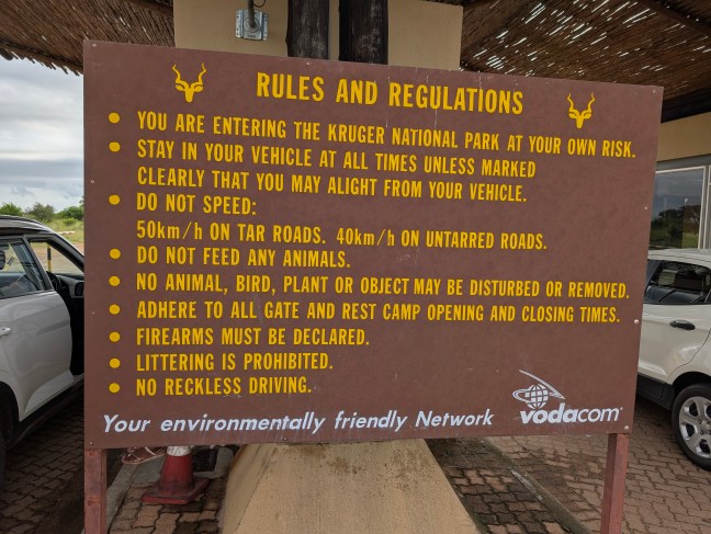 Die Anfahrt zum Park ist nur 20 Minuten und die Schlangenlinienfahrt akzeptiere ich dann doch, weil wir den großen Schlaglöchern auf der Teerstraße ausweichen müssen. Am Einlass Phabeni Gate gibt es dann einen kurzen Schlagabtausch zwischen Guide gleichzeitig auch Fahrer und den Rangern, was bei einer Reifenpanne zu tun ist. “ Anrufen, nicht aussteigen, wir helfen dann, Notfallnummer hast du ja!“