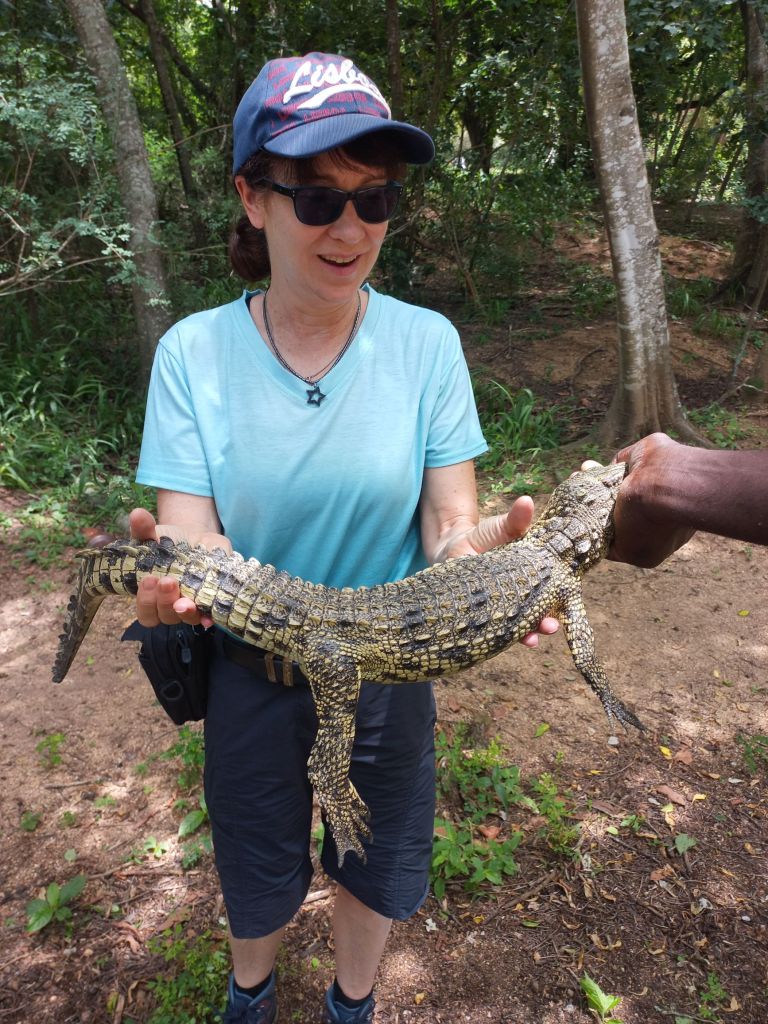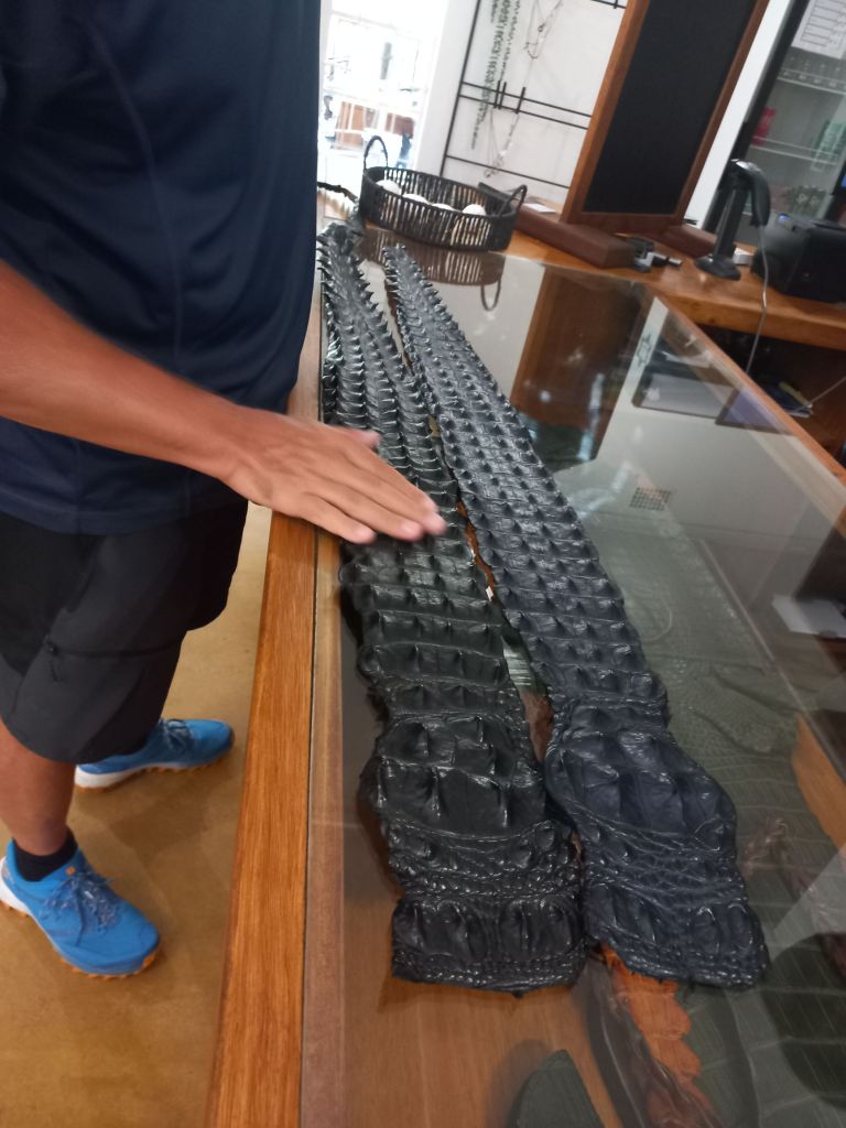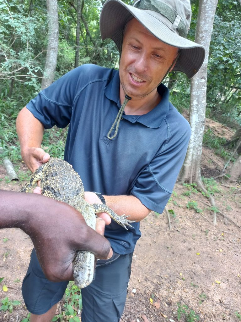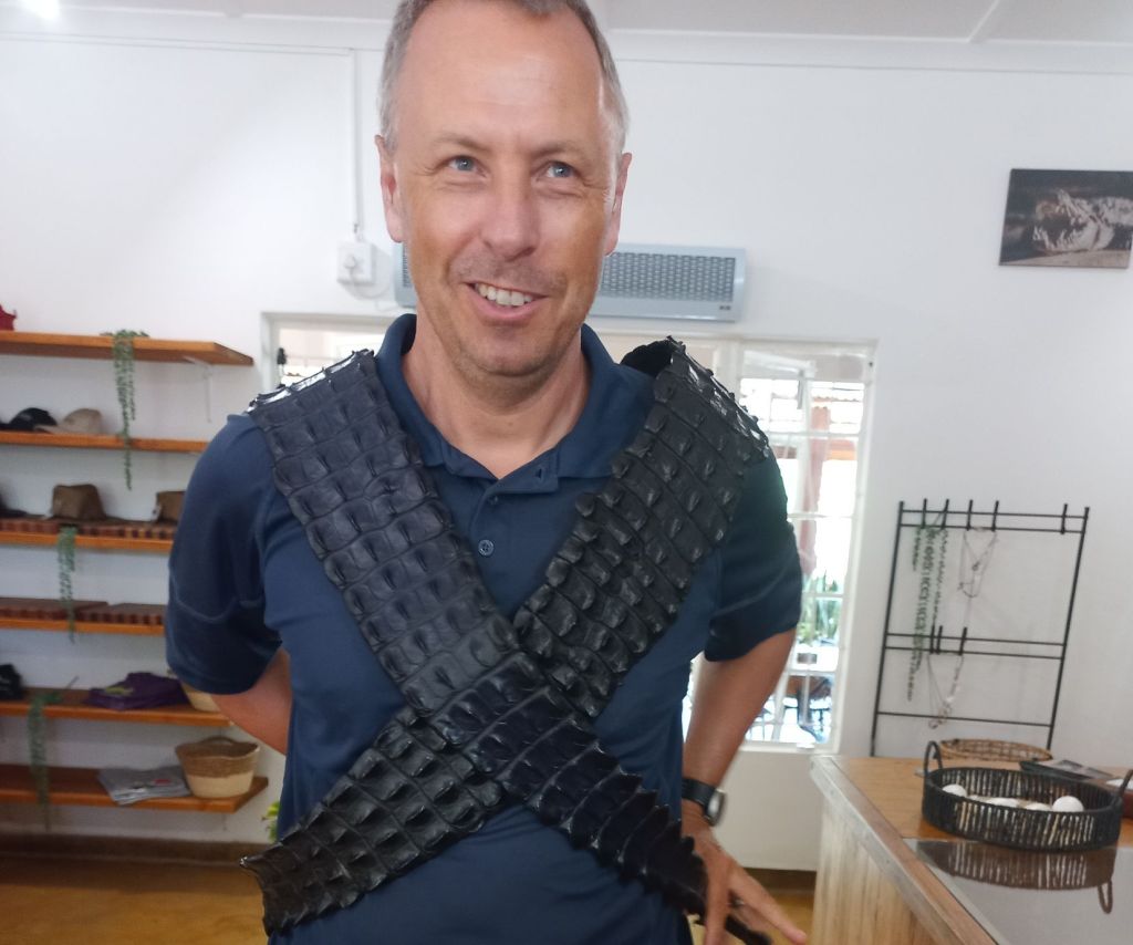 Die Krokodil Tour geht erstmal harmlos los mit Theorie und Krokodilhäuten zum anfassen, bzw Faxen machen.
