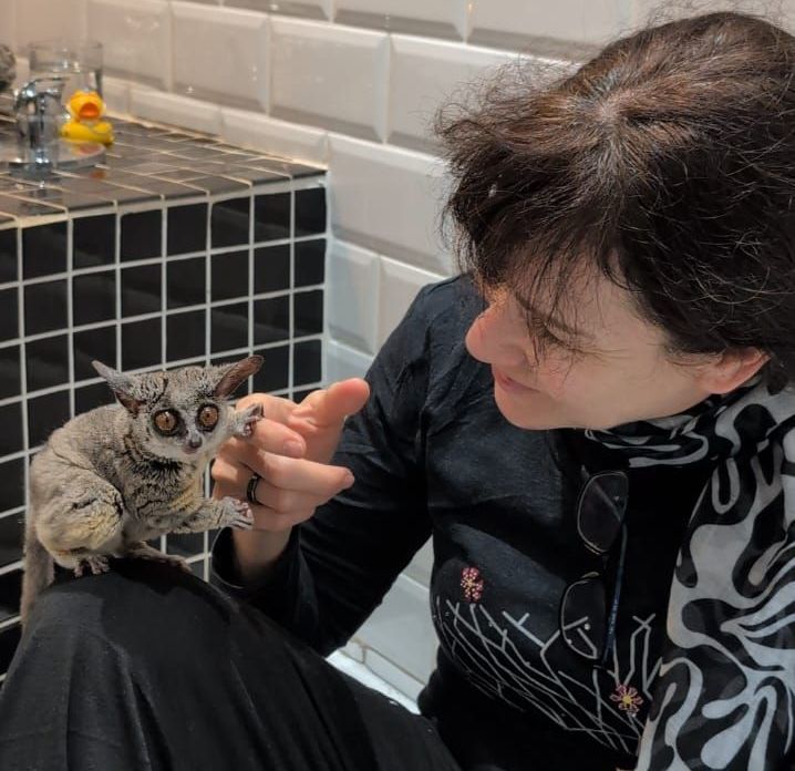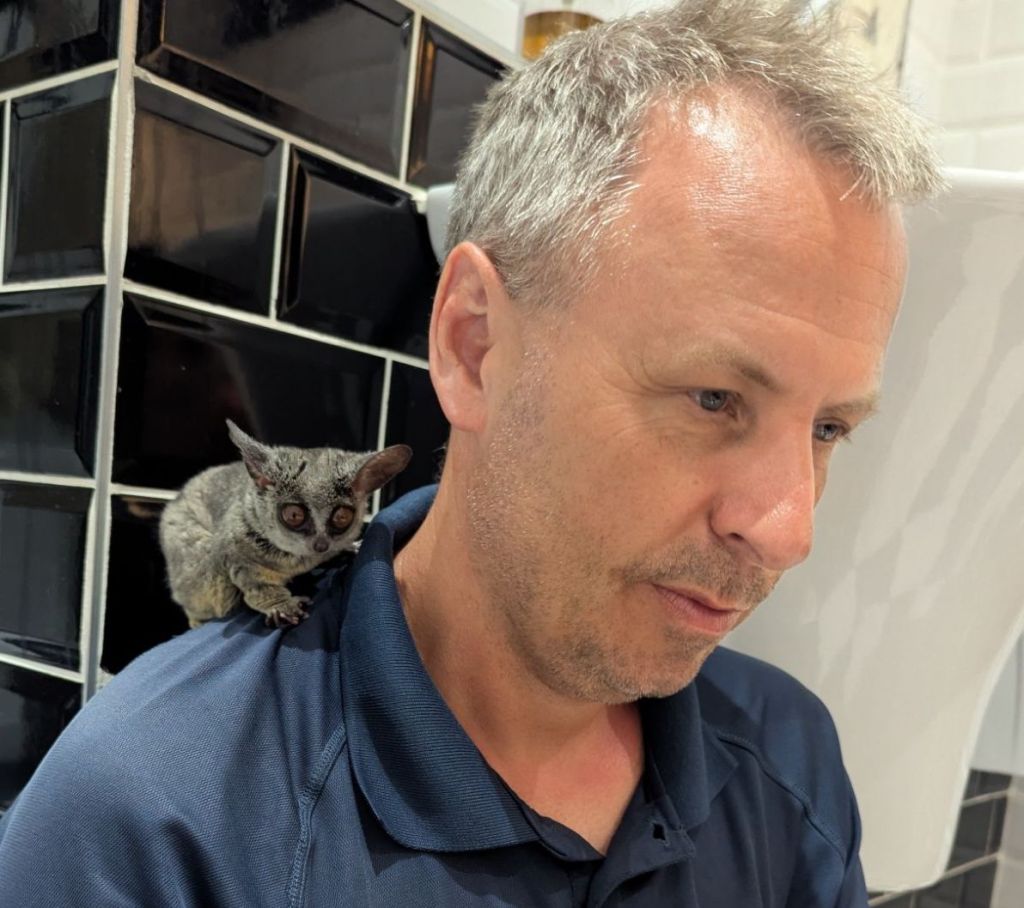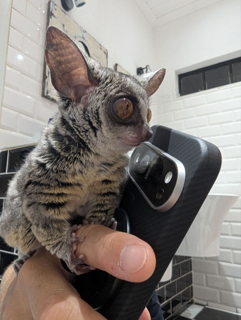 Ich stelle vor, das süßeste Bush-Baby aller Zeiten, ein Waisenkind, das von Menschenhand aufgezogen wird.