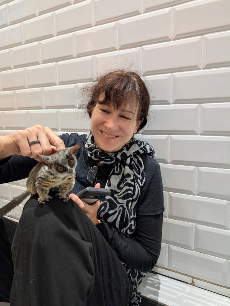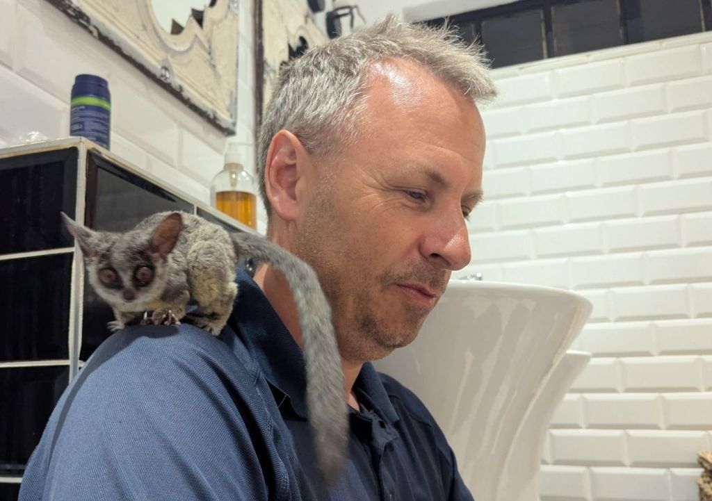 Wir sollen mit ins Badezimmer von Patricia kommen und dürfen ihr Bush-Baby füttern. Was auch immer ein Bush-Baby ist.