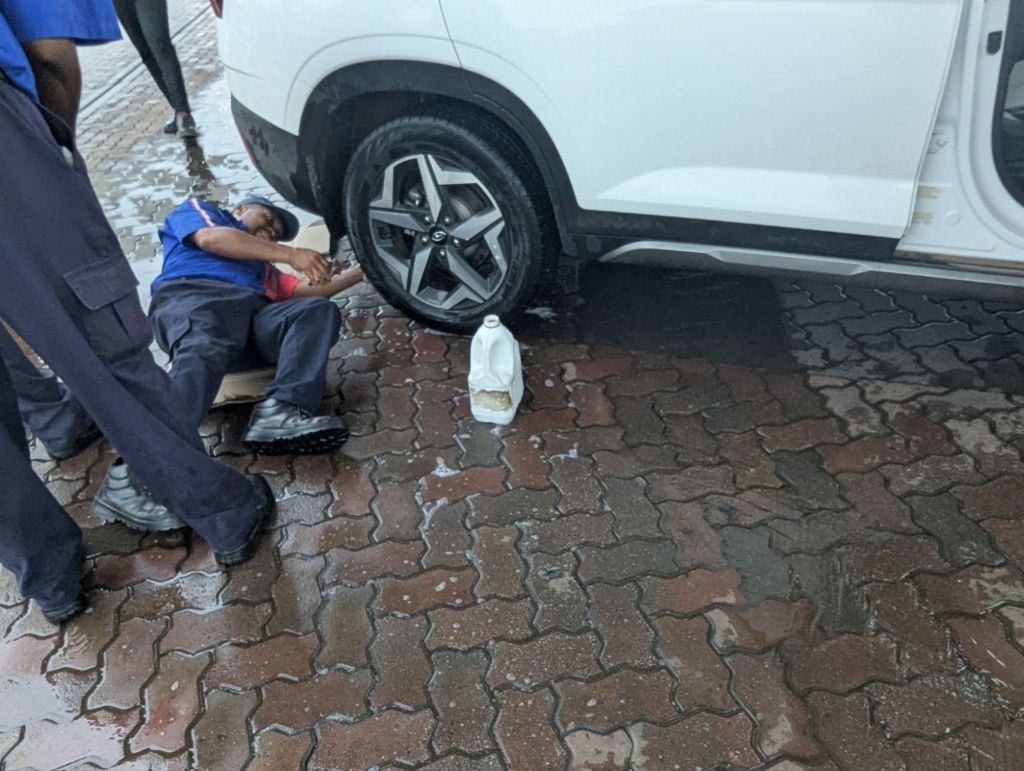 Ich glaube ja nicht an solche Geschichten mit Fluch und so, aber es scheint doch etwas dran zu sein. Marcus fährt die holprige Straße entlang und das Auto zeigt die Warnmeldung Druckverlust im Reifen an. Das ist mal wieder typisch Marcus, er ist der perfekte Reifenplattmacher. ( USA -Platten, Albanien-Platten) Wir schaffen es noch bis zur Tankstelle in Sabie. Bei strömendem Regen erkläre ich den Tankwarten, dass wir nach den Reifen gucken müssen. Der Hinterreifen auf der Fahrerseite verliert Luft, wir haben uns irgendetwas in die Lauffläche gefahren.