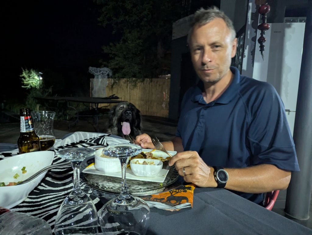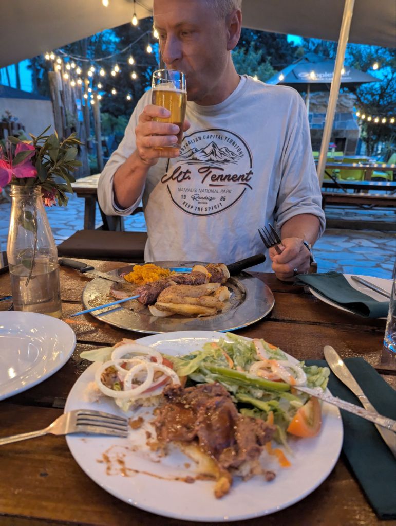 Wir bekommen auf der Terrasse ein köstliches Dinner serviert, das die 9 Haushunde am liebsten selbst verspeisen würden.