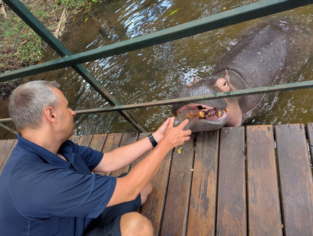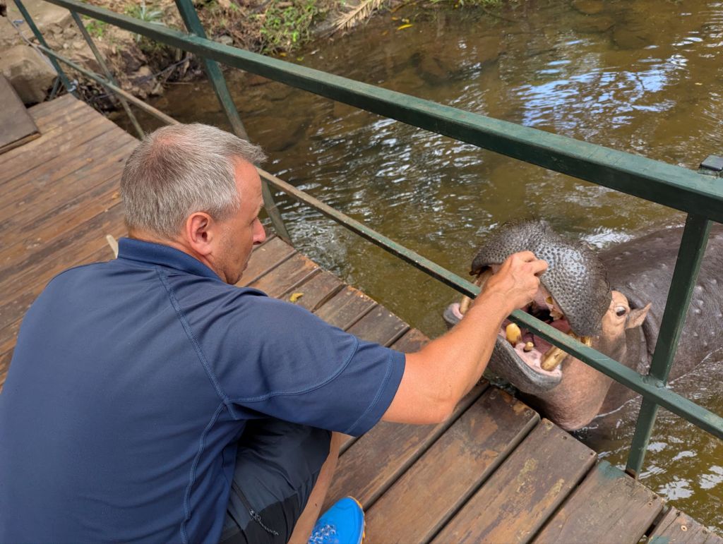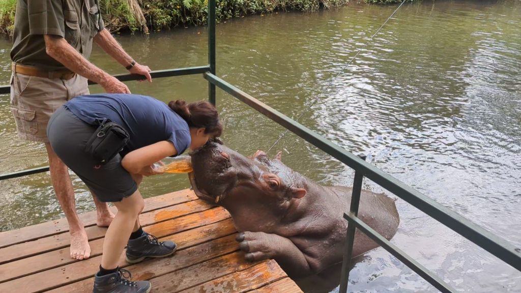 Toni hat mit seinen inzwischen 3 Flusspferden den Gegenbeweis angetreten, Mama Jessica mit Baby und ein weiteres angeschwemmtes, gerettetes Baby sind handzahm. Sie lassen sich streicheln , füttern und saugen gerne die angebotene Flasche mit Rooibos Tee leer.