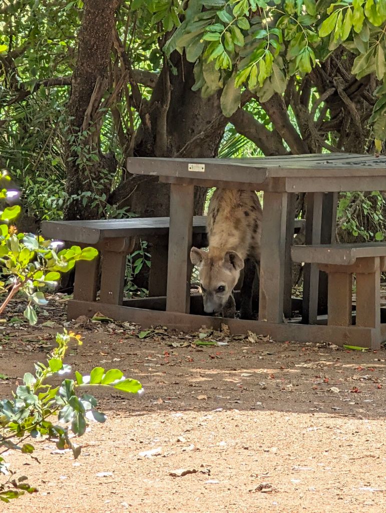 Beim Mittagsstopp treibe ich mich kurz im Shop rum und bekomme direkt einen Anranzer : “ Selbst schuld, wenn man lieber Souvenirs shoppt, wenn hier draußen die Hyäne rumschleicht!“