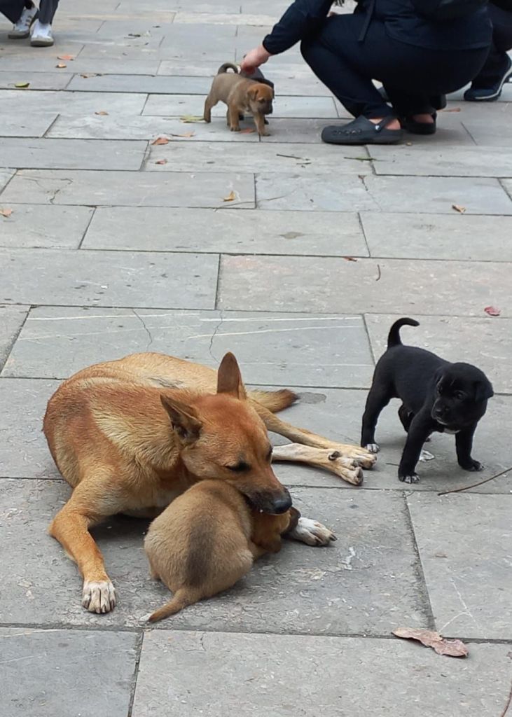 Eine Patchwork Familie von zwei Hundemamas, die ihren Nachwuchs kurz zusammen zurück gelassen haben.